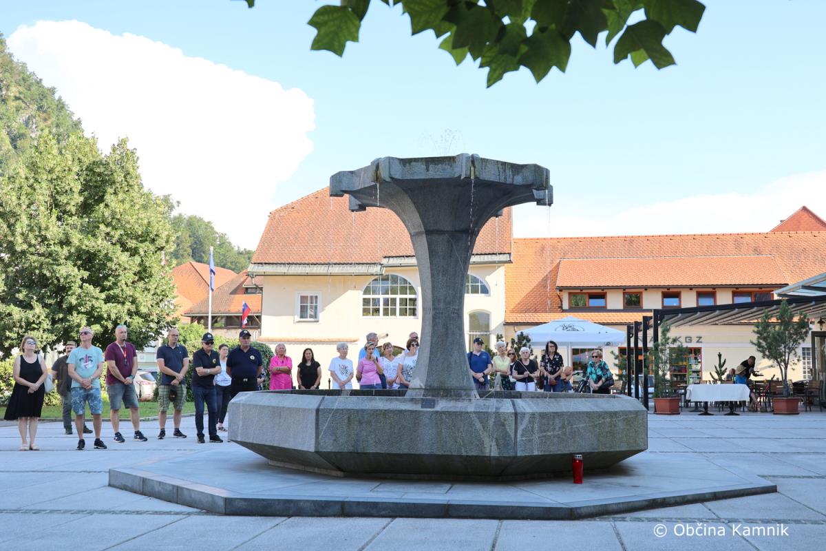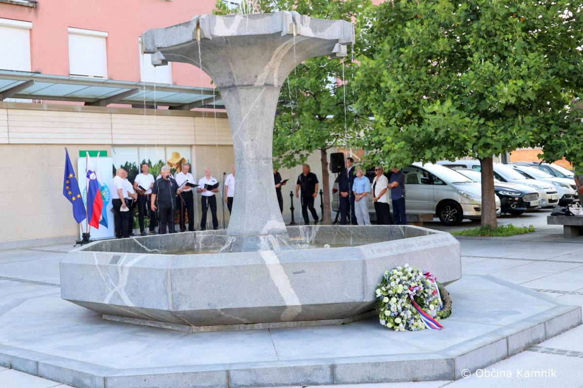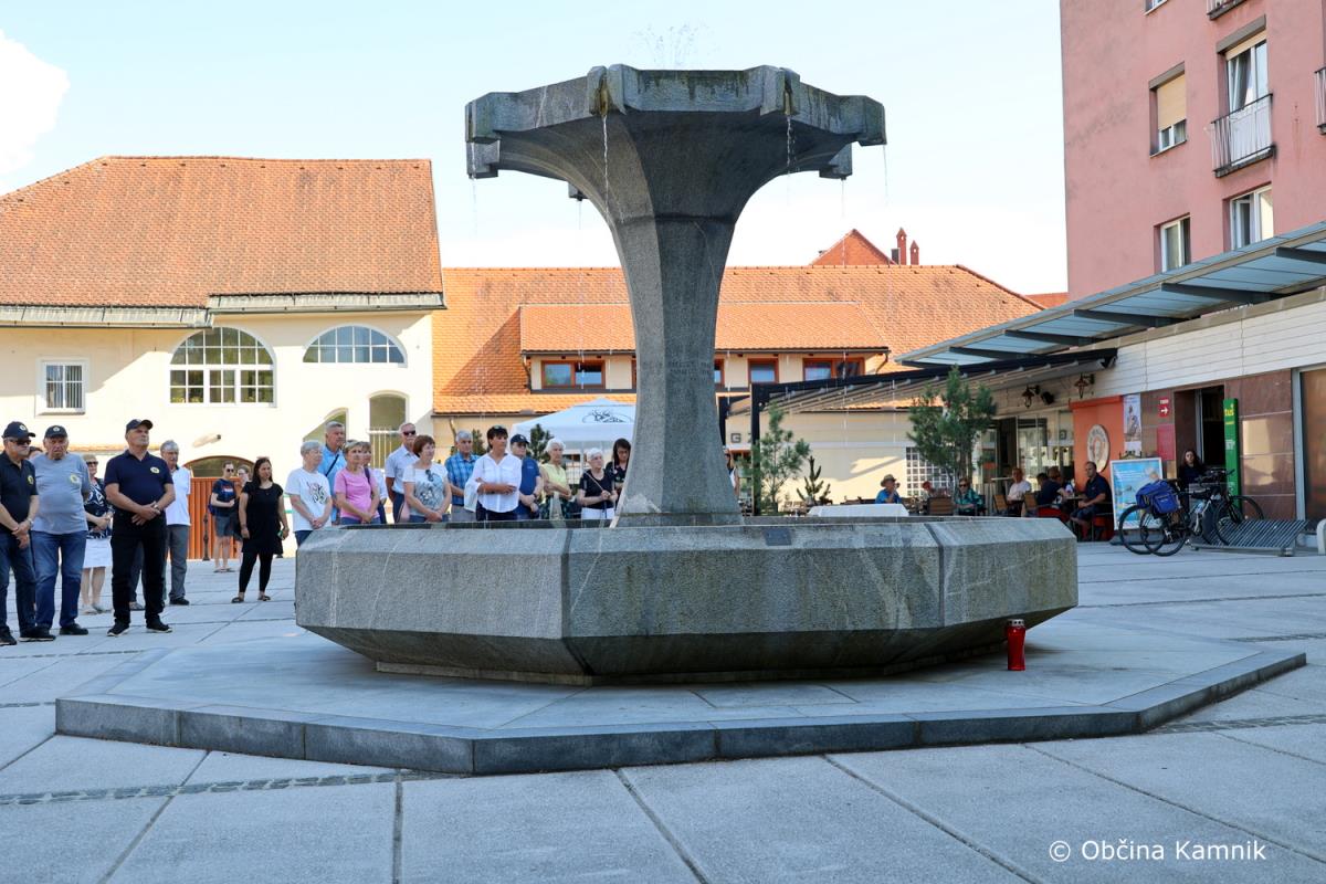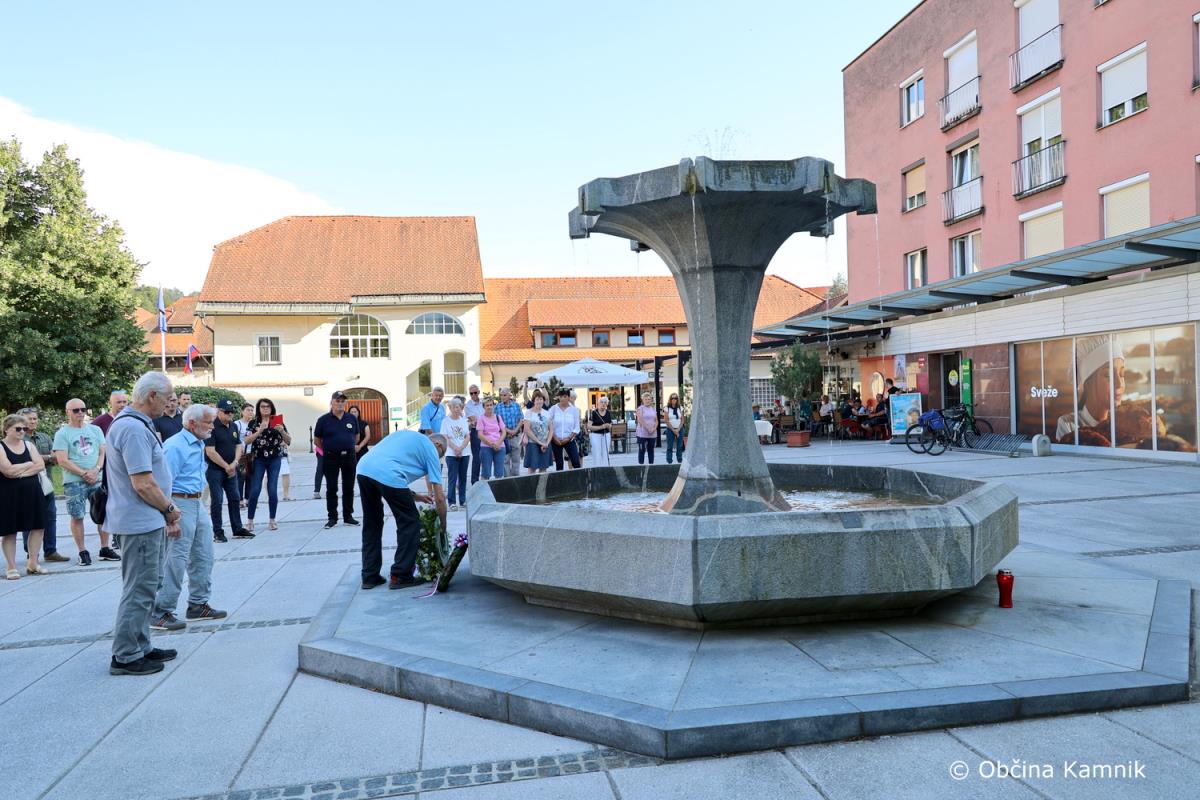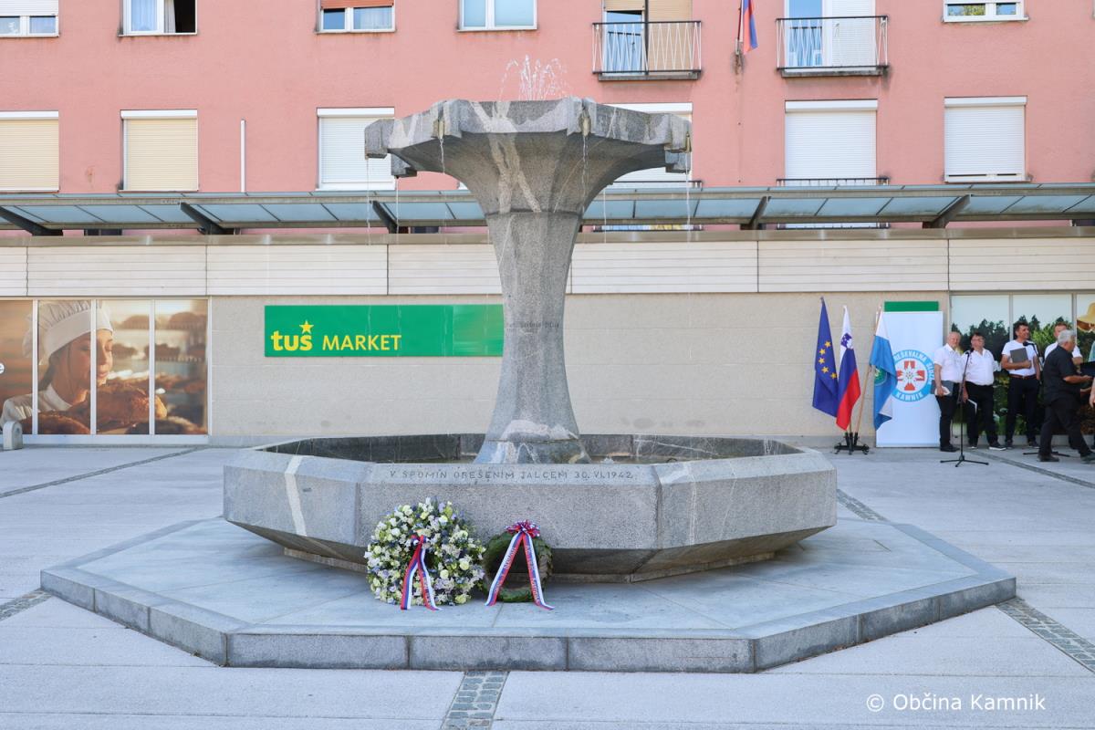 Udeležence spominske slovesnosti je pozdravil tudi župan Matej Slapar. Dejal je, da je bilo osem pogumnih in domoljubnih Kamničanov, plemenitega srca, na najbolj okruten način umorjenih leta 1942. Župan je dodal, da je osemkotno fontano leta 1972 zasnoval arhitekt Bojan Schlegl v spomin na teh osem junakov, danes pa je opomnik, da se grozodejstva vojne ne bi nikoli več ponovila.