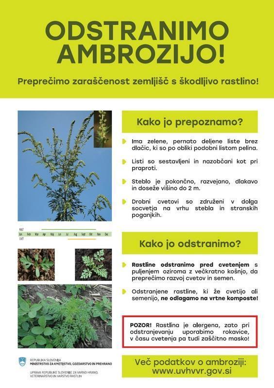 To so edine škodljive rastline, za katere je v Sloveniji predpisano obvezno zatiranje, ko je bila v letu 2010 sprejeta sprememba zakona o zdravstvenem varstvu rastlin, in sicer od na pričetka rastne dobe ambrozije.