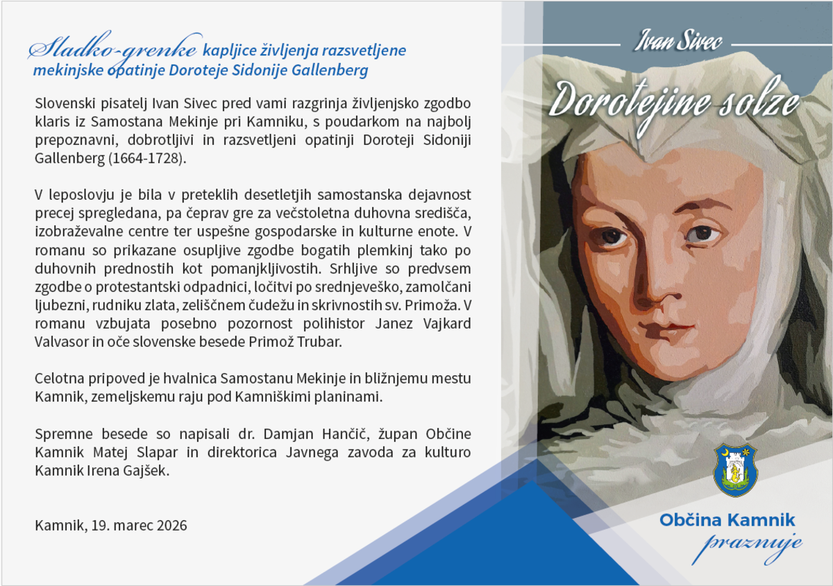 V četrtek, 19. marca 2026, je samostan Mekinje zasijal kot prizorišče izjemnega literarnega večera ob praznovanju občinskega praznika Občine Kamnik. Predstavitev romana Dorotejine solze Ivana Sivca je pritegnila številne obiskovalce, vzdušje pa je bilo navdušujoče in polno čustev. Prvi snop knjig je Sivec ob koncu dogodka razprodal, kar je potrdilo tako zanimanje za avtorja in njegovo delo kot spoštovanje do bogate zgodovine Mekinj in Kamnika.
