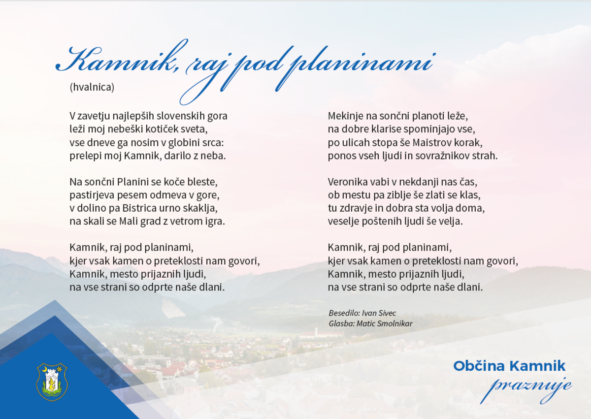 Poseben trenutek večera je bila premierna izvedba pesmi Kamnik, raj pod planinami. Besedilo je napisal Ivan Sivec kot hvalnico Kamniku, uglasbil pa ga je kamniški glasbenik Matic Smolnikar. S pevko Tejo Poljanšek sta pesem ob spremljavi kitare prvič predstavila prav na literarnem večeru, občinstvo pa jo je sprejelo z navdušenjem.