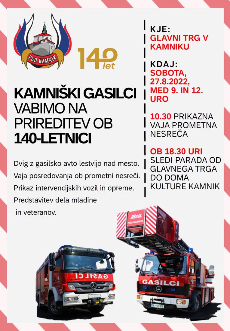 Gasilke in gasilci Prostovoljnega gasilskega društva Kamnik letos praznujemo 140 let delovanja. Vabimo vas, da se nam v soboto, 27. avgusta 2022, pridružite v Kamniku, ko bomo v dopoldanskem času na Glavnem trgu pripravili predstavitev našega društva, popoldan pa bo od Glavnega trga do Doma kulture Kamnik potekala parada.
