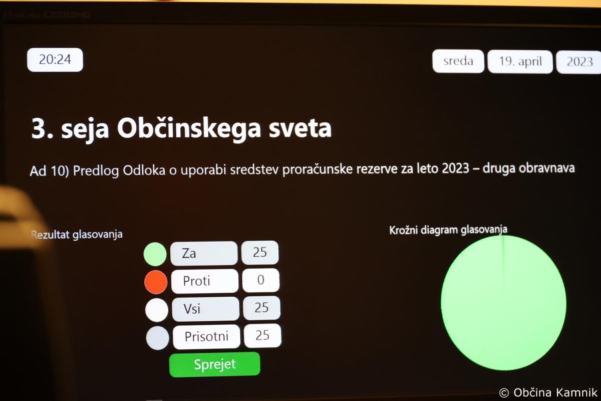 V nadaljevanju pa je bil v drugi obravnavi s 25 glasovi za sprejet še Odlok o uporabi sredstev proračunske rezerve za leto 2023, ki ga je predstavila pomočnica vodje Oddelka za gospodarske dejavnosti, gospodarske javne službe in finance Marija Kos: »V odloku so predlagani naslednji predlogi porabe sredstev proračunske rezerve sanacija zemeljskega plazu pod JP661345 Laze-Vrhač (do 35.000 evrov), sanacija zemeljskega plazu pod nekategorizirano cesto Zagorica nad Kamnikom 5d (do 20.000 evrov), sanacija zidu na pokopališču Sela pri Kamniku (do 25.000 evrov), preventivni ukrepi na vodotokih (do 50.000 evrov), sofinanciranje kmetijskih plazov (do 20.000 evrov), sofinanciranje urejanja vodotokov – DRSV (do 90.000 evrov).«