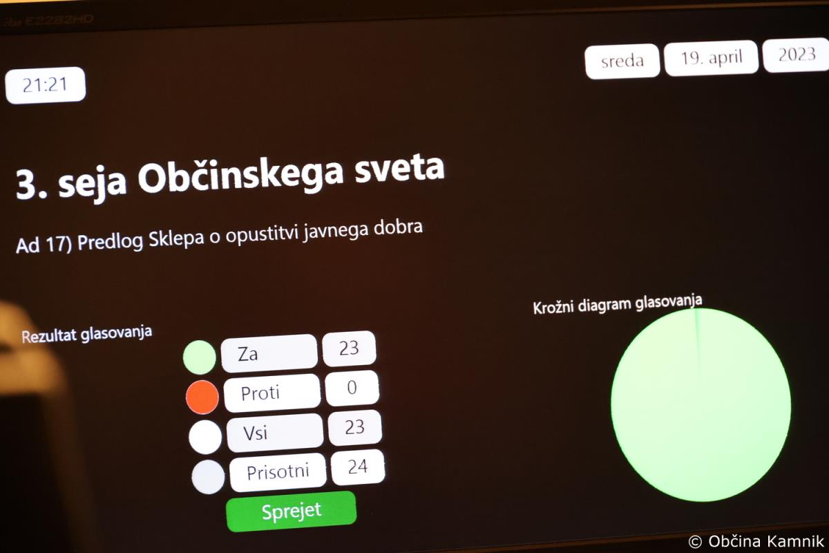 Sklep o opustitvi javnega dobra je bil sprejet s 23 glasovi za, kot zadnja točka pa sprejet Okvirni programa dela Občinskega sveta Občine Kamnik za leto 2023 s 23 glasovi za.