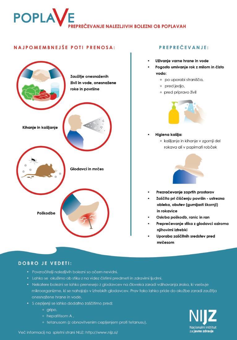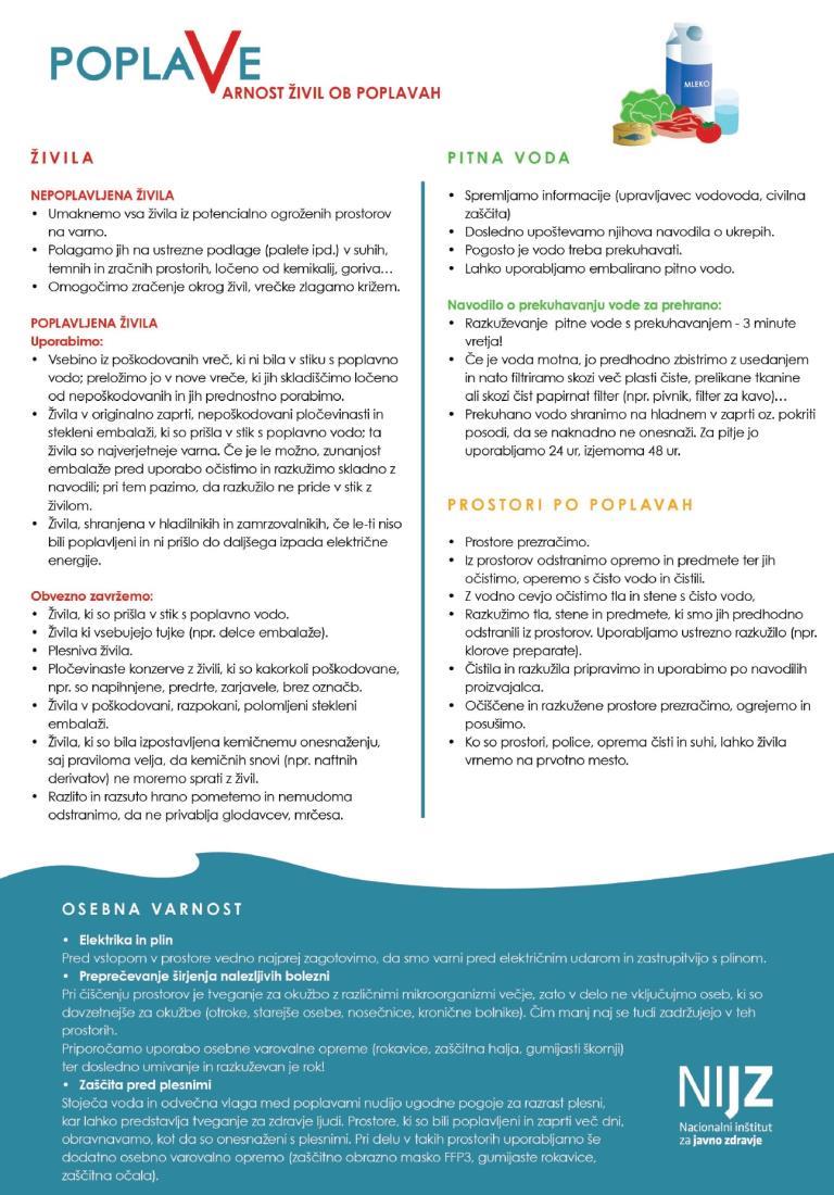 Občanke in občane obveščamo, da je Nacionalni inštitut za javno zdravje pripravil priporočila in usmeritve v zvezi s pitno vodo in ravnanjem z živili v primeru poplav.